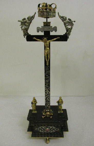 Christ hangs high on an ebony cross, inlaid with silver and standing on a skull and crossbones. Far below, or so it seems (the whole object is just over a foot high), stand the Virgin Mary and St John, slightly smaller in scale. The figures are gilt-metal, and the modelling of the entirely gilded body of Christ is particularly fine. On the arms of the cross, two silver angels point to a crown of gold.