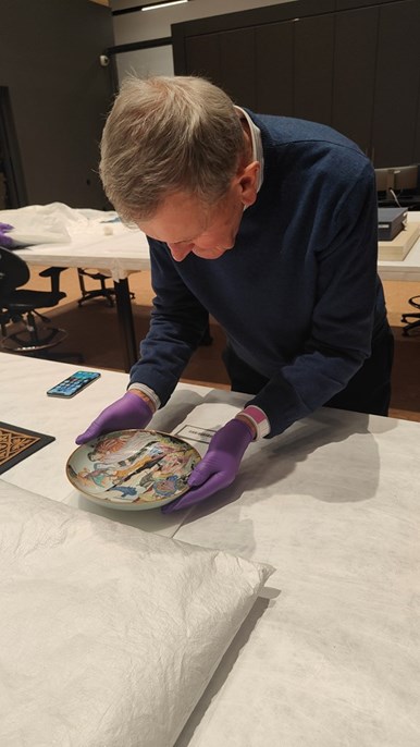 Vicky WalkerNeil MacGregor examines a dish at V&A East Storehouse