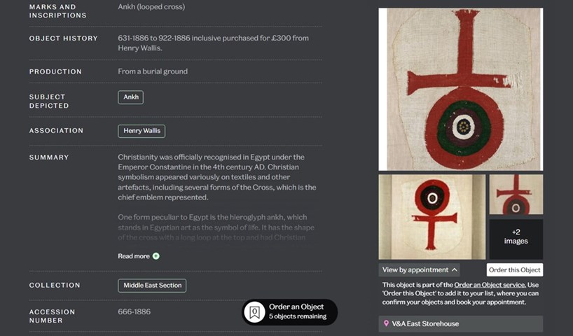 Screenshot of the V&A website showing an Egyptian hieroglyph ankh, one of thousands of items available to order to view in person