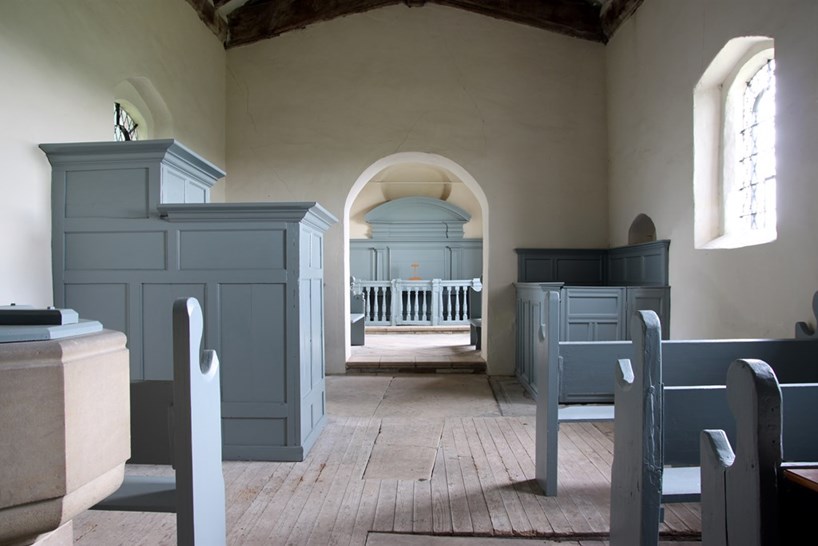 Picture a little boxy red-brick barn, with a gable and bell turret at the west end. There are two plain windows on the south and north sides, and then a chancel shoved on the east end. It looks like nothing special at first — not worth the muddy trek from the A158 — but it sits in its setting in a way that makes you persevere. You will be glad you did when you look inside. It has the most perfect interior of its kind I can think of, from a tiny western gallery to a double-decker pulpit, to Laudian altar rails; oddments made coherent by the economy of the space they have to fit into. And to assist in that, it is painted in the pale, puttyish colours that make narrow spaces look wider, and Farrow & Ball ones sought-after.