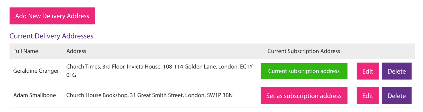 Select Delivery and Payment. Add a new delivery address, then set this as your subscription address: