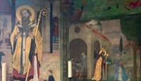 If pushed for a favourite, I might choose St George’s, Trotton, in West Sussex: c.1300, with its glorious west-end wall painting and exceptional early brasses. The complete 14th-century Last Judgement painting depicts in red monochrome Christ sitting on a rainbow above Moses with the tablets of the law. Underneath is evil man, surrounded by the seven deadly sins issuing from the jaws of dragons, and good man, surrounded by roundels of the seven acts of mercy. The church also houses the earliest known full-length brass of a woman and a double brass of Sir Thomas Camoys — a great leader at the battle of Agincourt — under an elaborate canopy beside his wife.