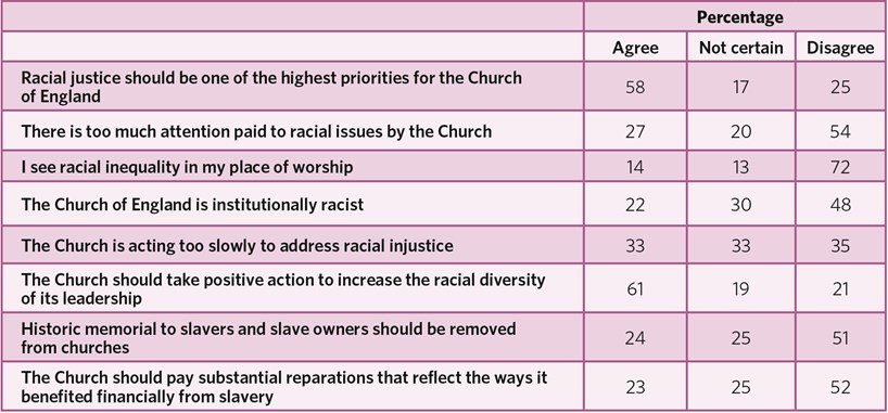 Overall responses to the different items are shown in the table above. From these we can deduce that more than half the respondents thought that racial justice should be a high priority for the Church, but one quarter disagreed. A similar proportion (27 per cent) thought that the Church was paying too much attention to racial issues. Very few (14 per cent) saw racial inequality in their place of worship, but slightly more (22 per cent) thought that the Church at large was institutionally racist.