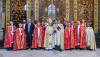 After the blessing, the choir sang Judith Bingham’s setting of verses from Psalm 133 — an anthem commissioned for the 2018 installation service — as Bishop Mullally went in procession with the area bishops and cathedral clergy to the high altar. She surrendered the diocesan crosier, and her mitre and chasuble were removed by her colleagues. Taking up her personal crosier, she then proceeded the full length of the cathedral to the font for further prayer and the dismissal.
