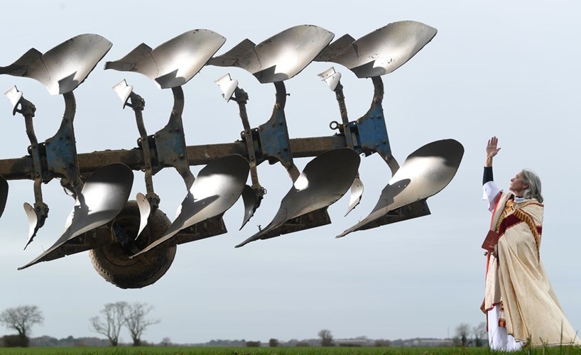 Country custom: The Revd Jo King blesses the plough of a farmer, Jonathan Bentall, in the parish of St Mary’s, Chidham, in West Sussex, on Plough Sunday